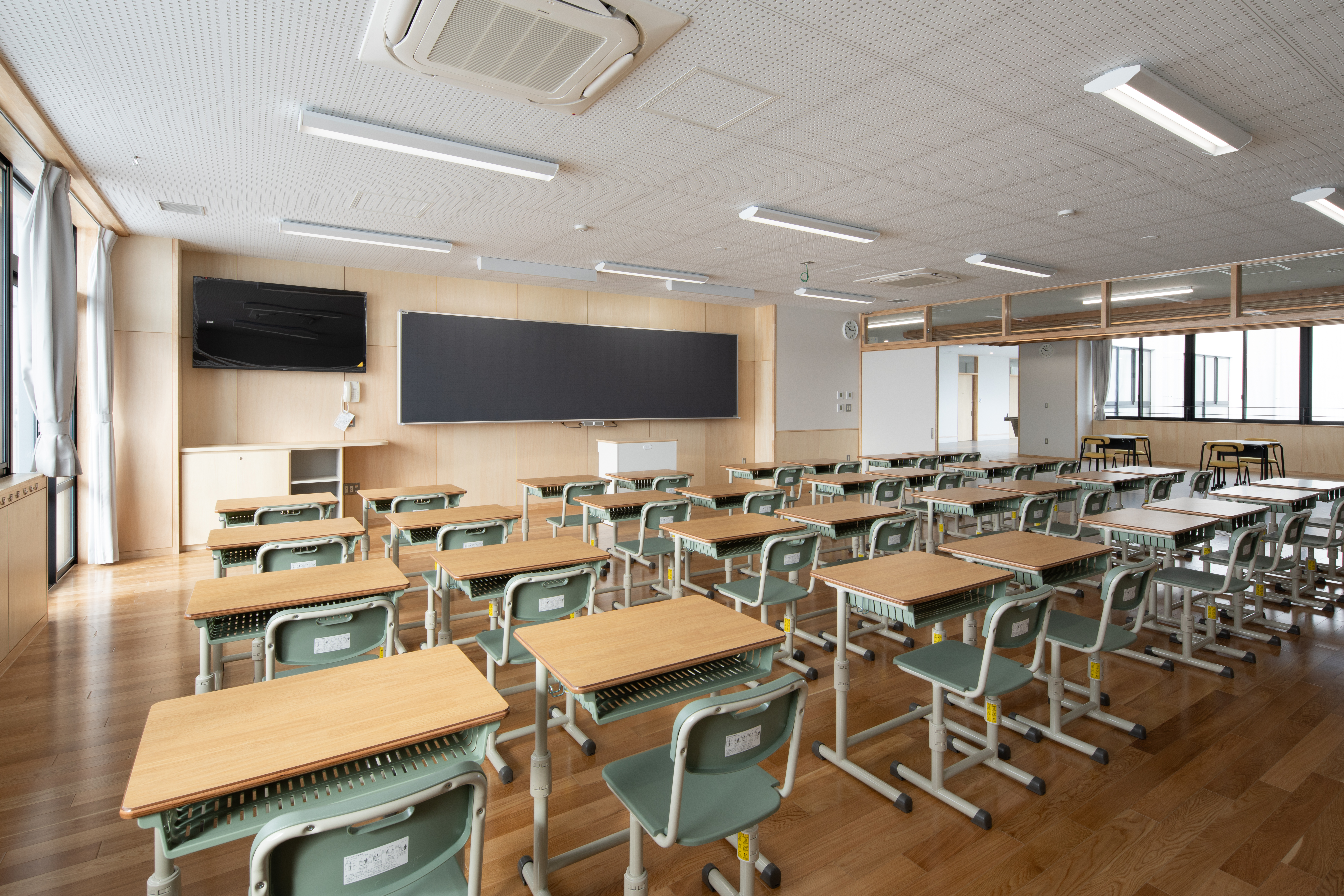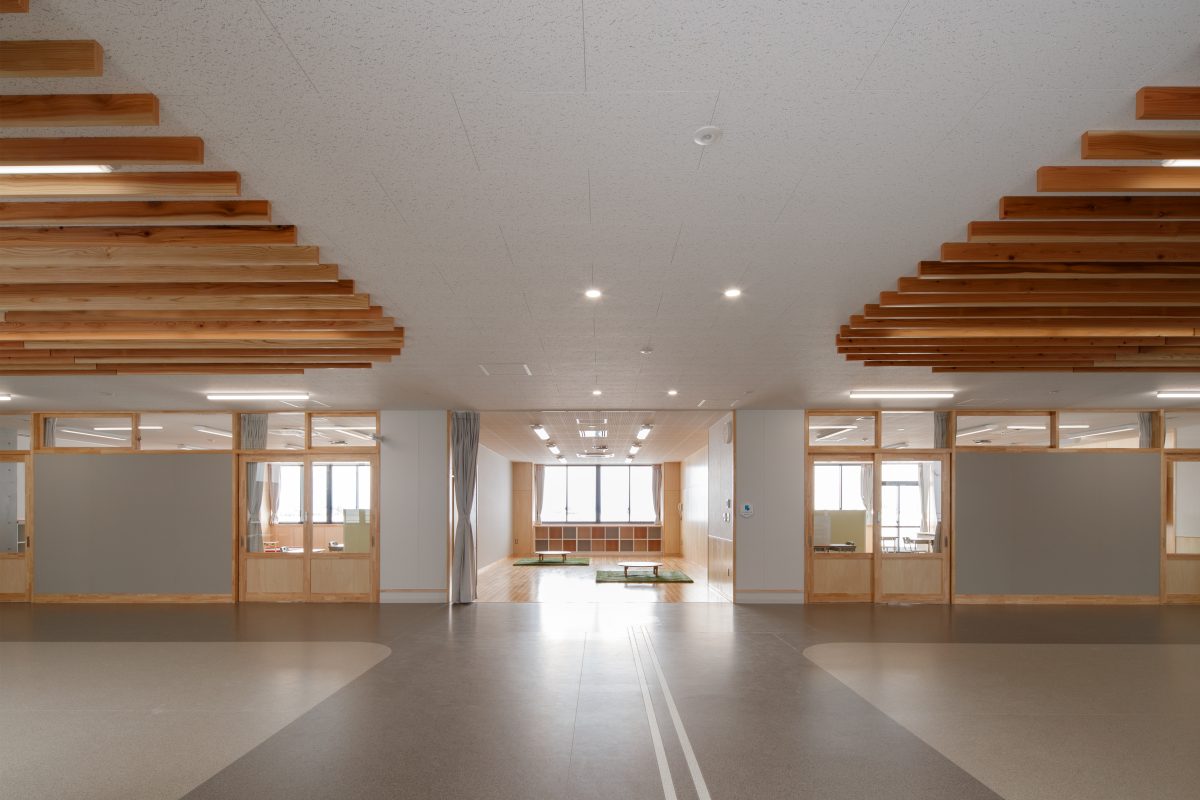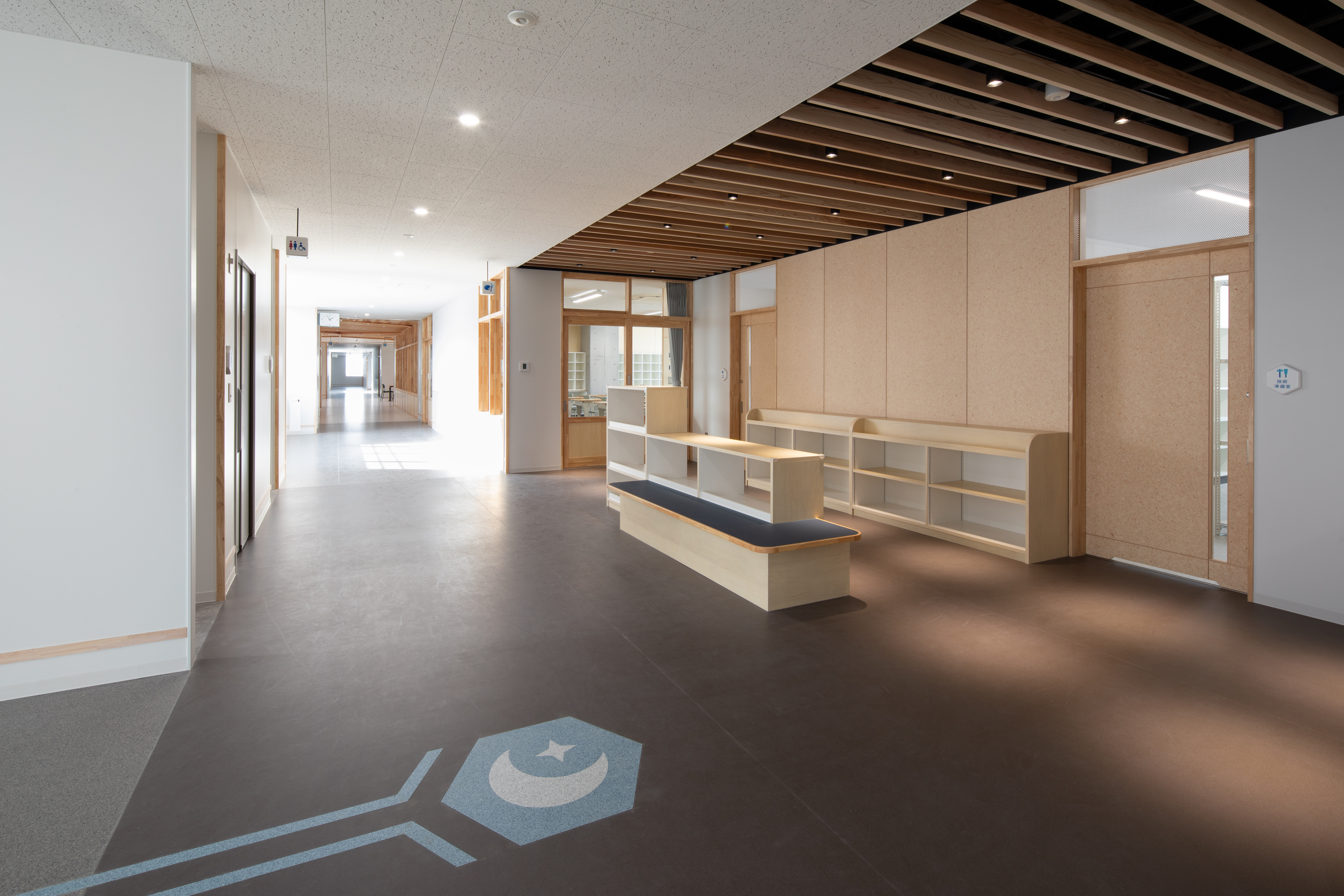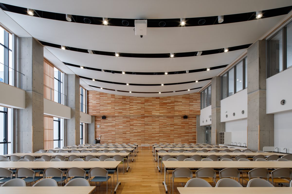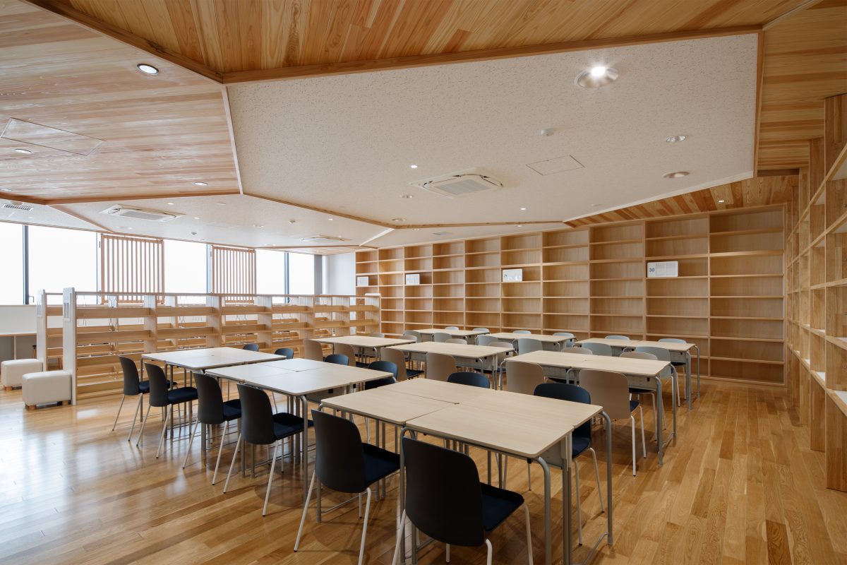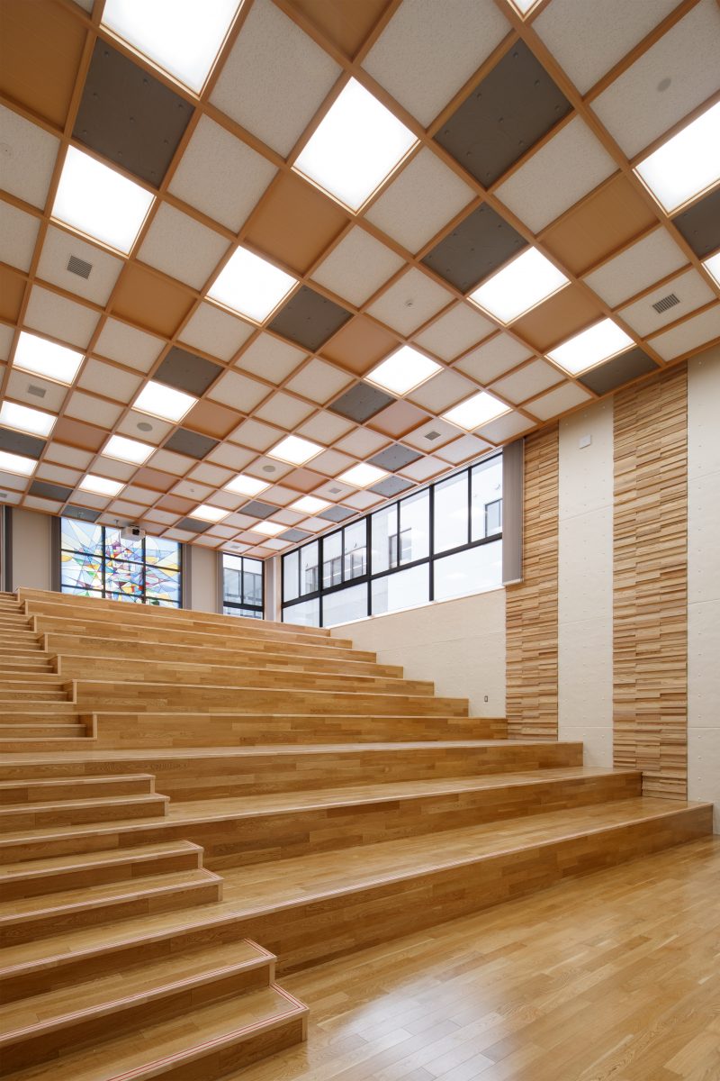 ランチルームや階段教室は、水橋の歴史や文化を学ぶ地域共創の場として整備しました。地場産杉や和紙ガラス、北前船モチーフの幕天井など地域の素材や意匠を取り入れています。