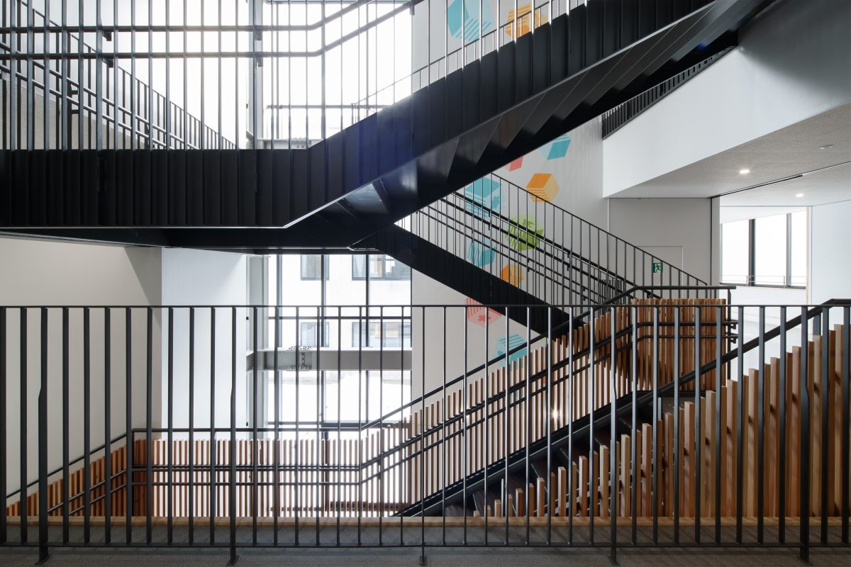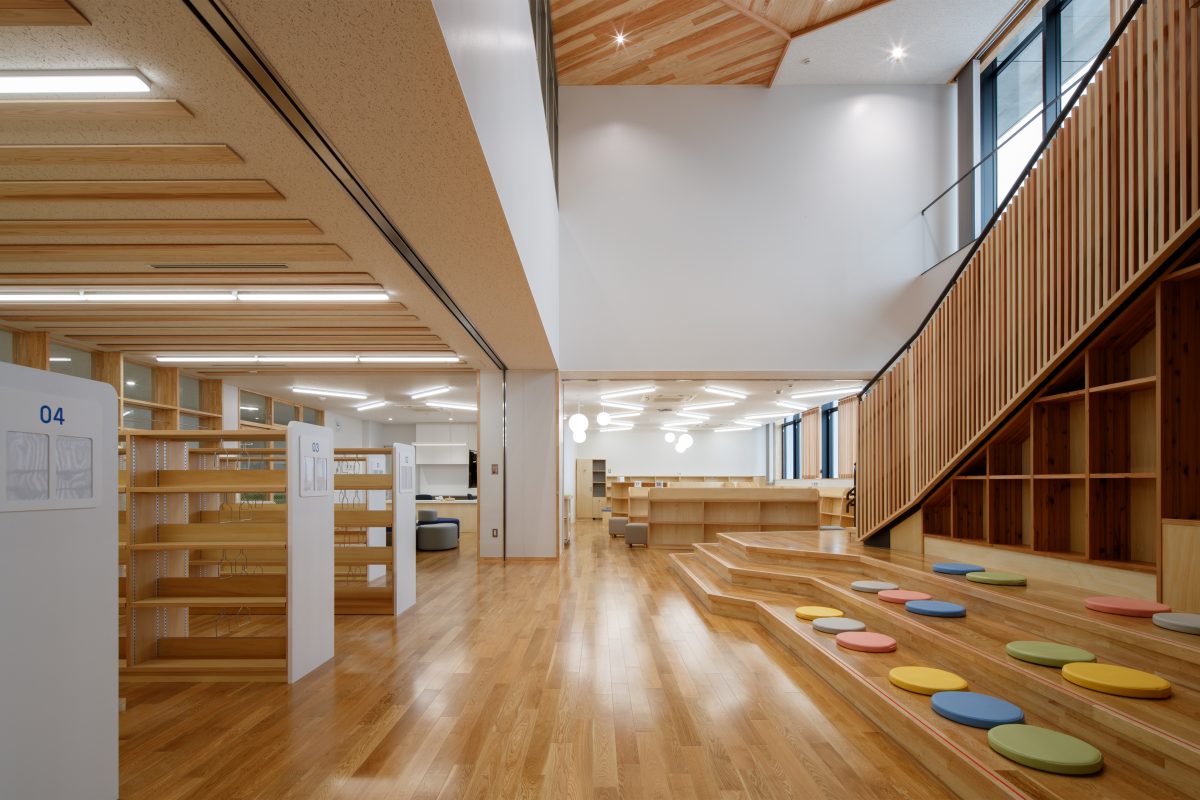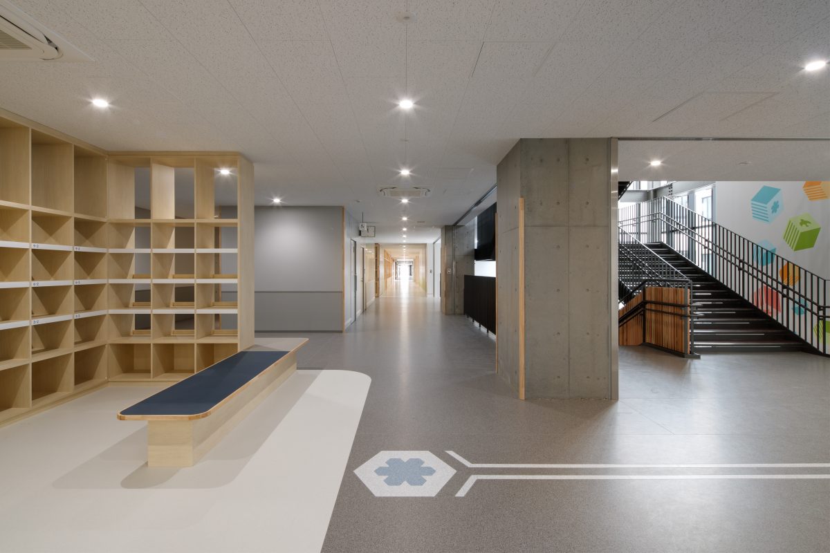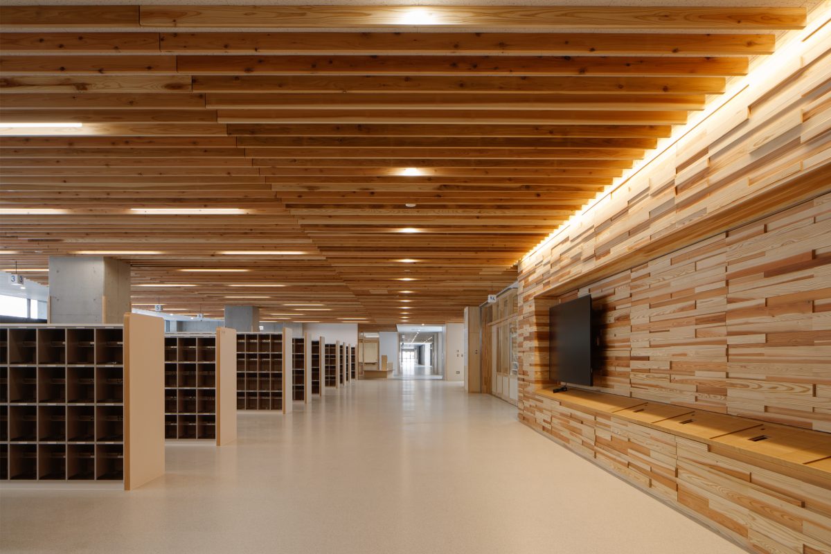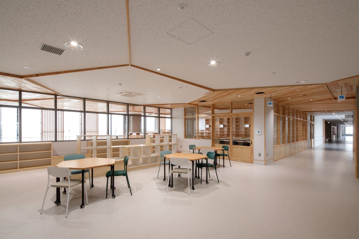 個別最適・協働的な学びを支える空間を校内各所に配置しました。中央には階段教室・図書室・メディアラボを縦につなぐ「ラーニングコア」を設け、交流や探究活動の核としています。