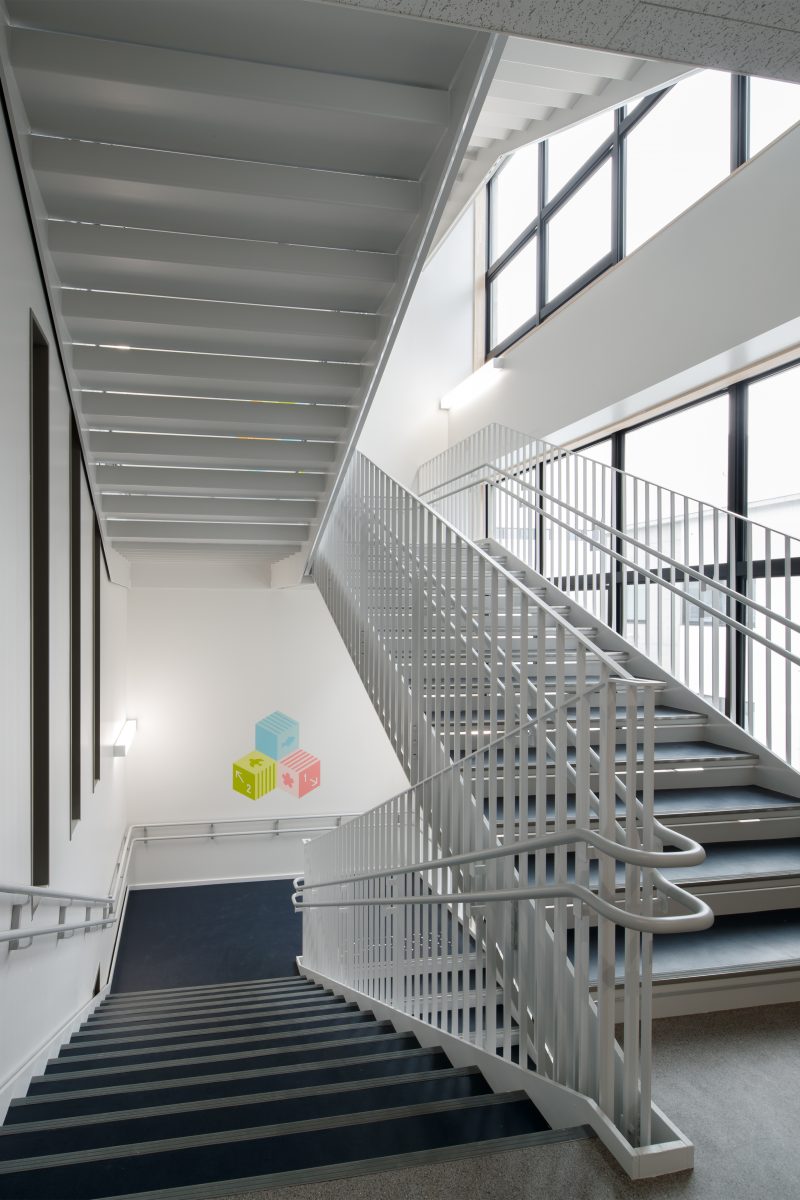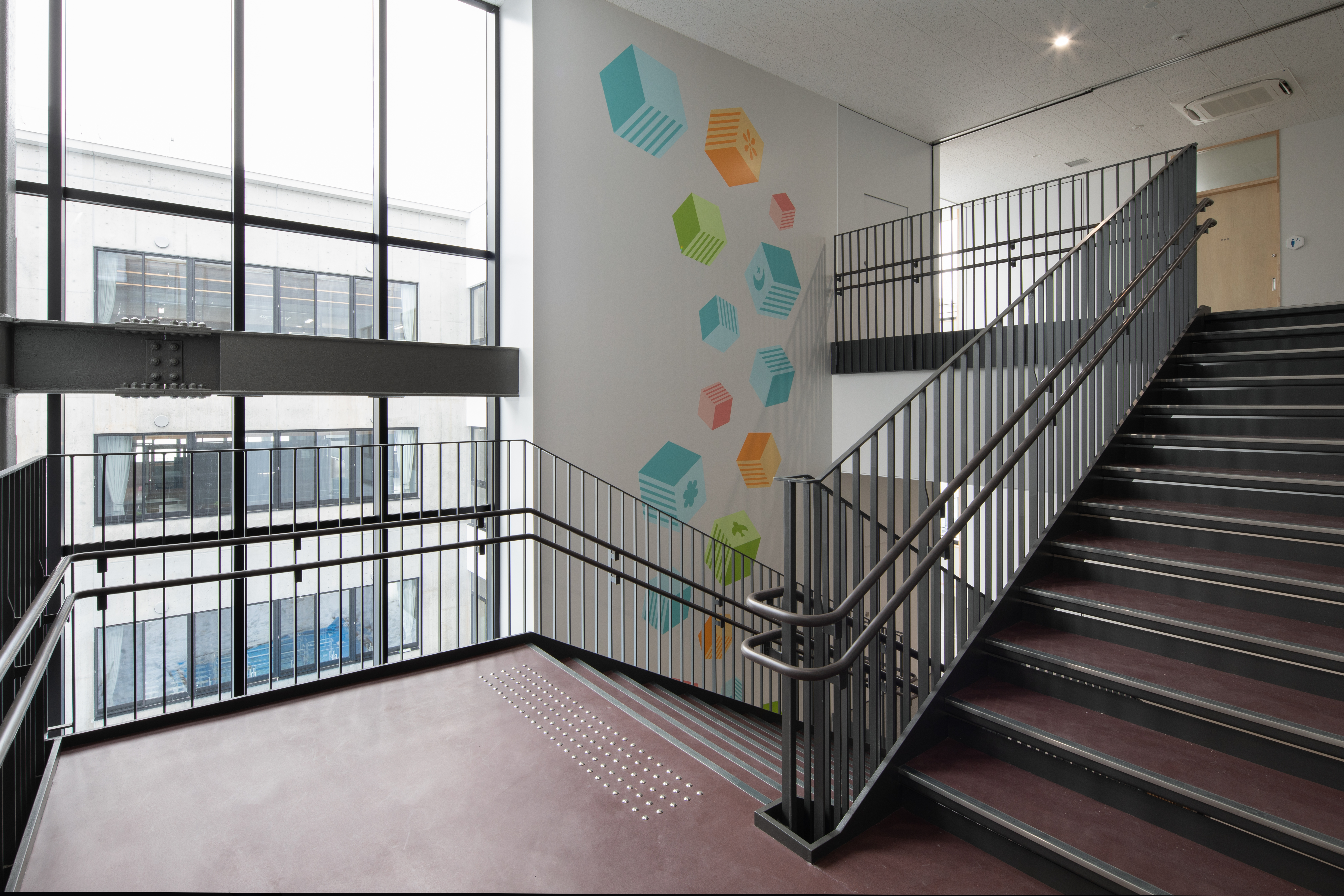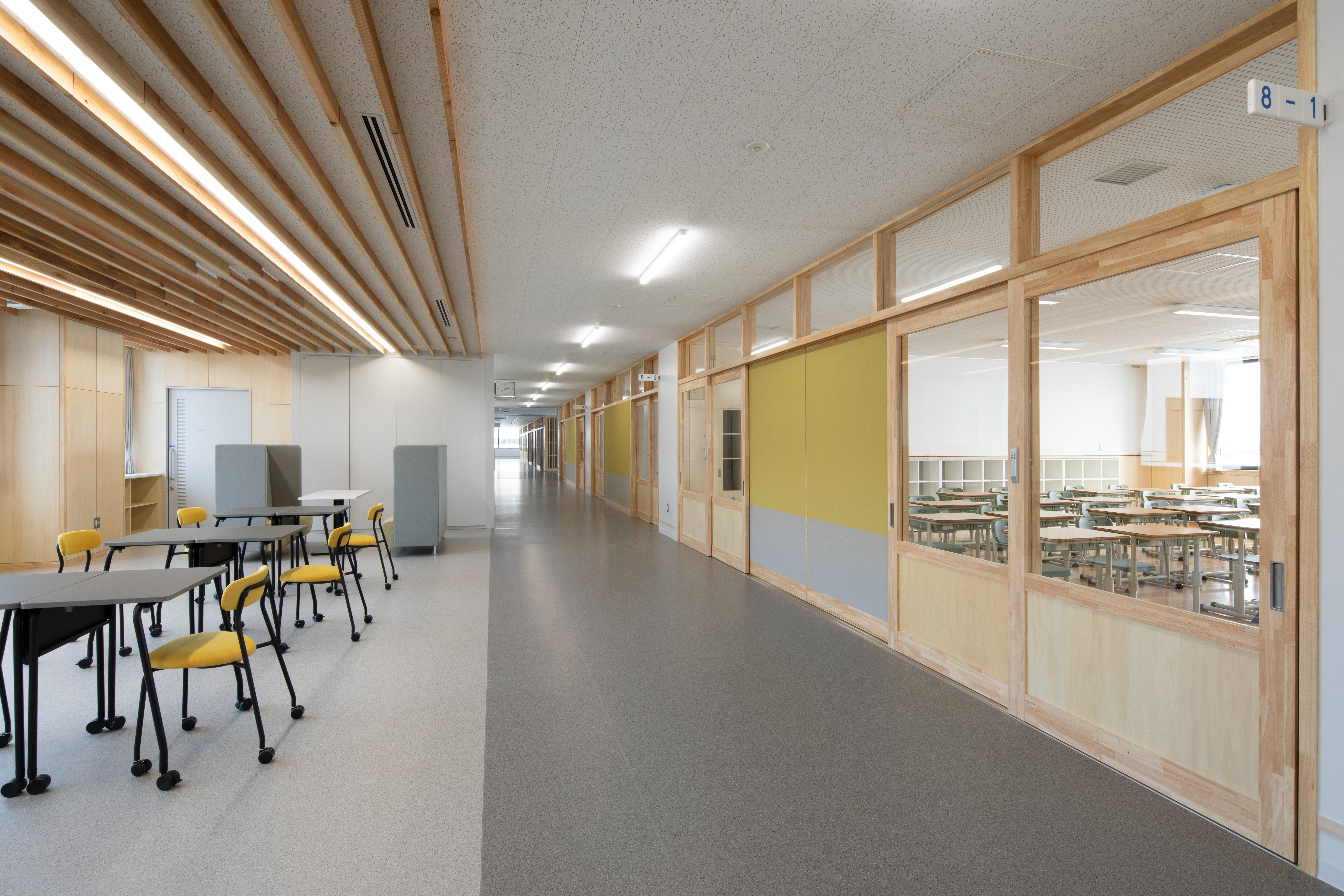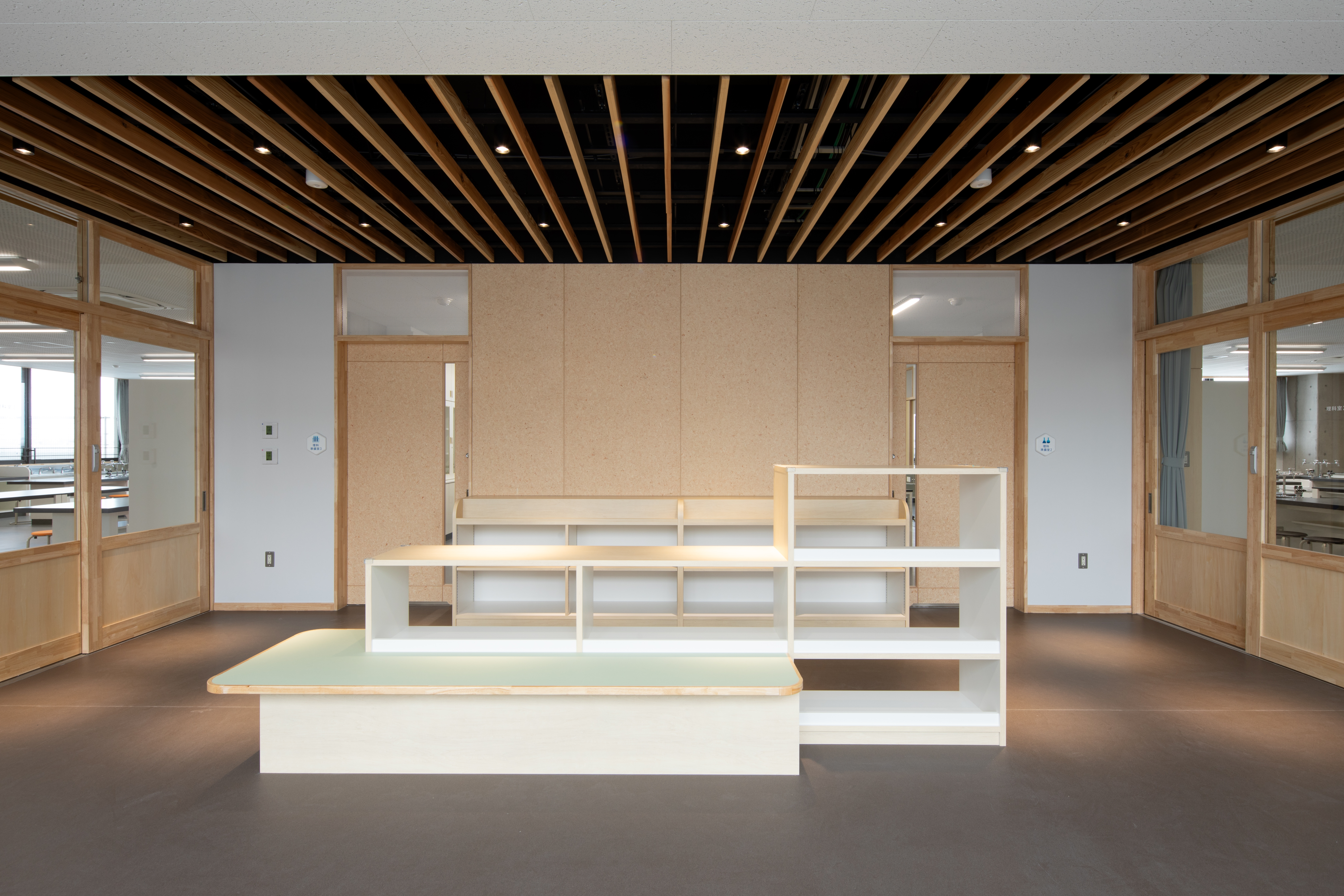 個別最適・協働的な学びを支える空間を校内各所に配置しました。中央には階段教室・図書室・メディアラボを縦につなぐ「ラーニングコア」を設け、交流や探究活動の核としています。